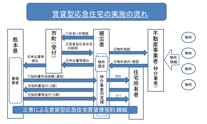 具体的には、「被災者」と「熊本県(借主)」と「物件所有者(貸主)」の三者で「定期建物賃貸借契約」を締結し、一定期間熊本県が家賃を支払います。